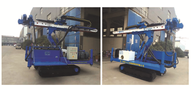 7、 水平舉升離地高度3.3米,雙油缸挖機式大臂,任何舉升狀態(tài)下都具備較好的穩(wěn)定性,可以同時施工兩排到 三排孔節(jié)省工時提高功效??伤健⒋怪?、仰角、負角狀態(tài)下施工,滿足多種施工工藝需要。扭矩、轉(zhuǎn)速可 以根據(jù)實際需要進行合理分配,推進架行程為3.4米,可進行3米的鉆桿、套管復合鉆進。配有履帶底盤、高 位旋轉(zhuǎn)平臺、大直徑的支腿油缸、0.9米的滑架、孔口支撐裝置,使鈷機移位、定位為方便,鉆進時穩(wěn)定可 靠。配有夾持卸扣器,使裝卸鉆桿、套管勞動強度低、效率高。